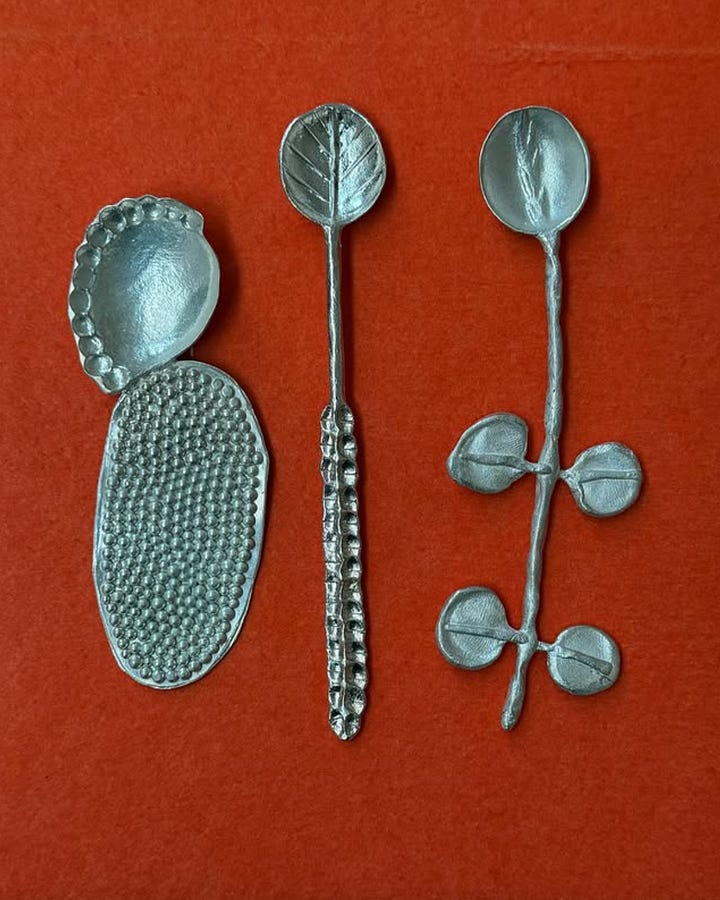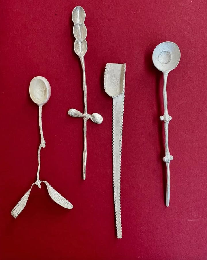 Having come across Gabi Veit, I learnt that she makes many things, but primarily spoons. They are crafted in wax with goldsmith’s tools, heat and fire, or household knives, pins and scissors. The wax can be kneaded, filed, drilled, carved, dripped and dipped. It allows for precise work, as well as spontaneity, and it can be shaped and moulded by hand. Gabi then makes the spoons in gold or silver, and sometimes blackens them too.