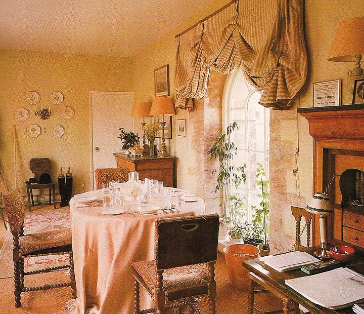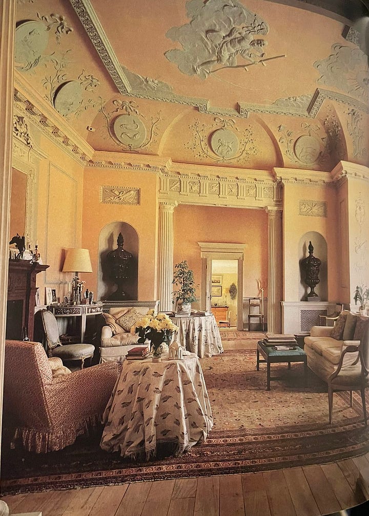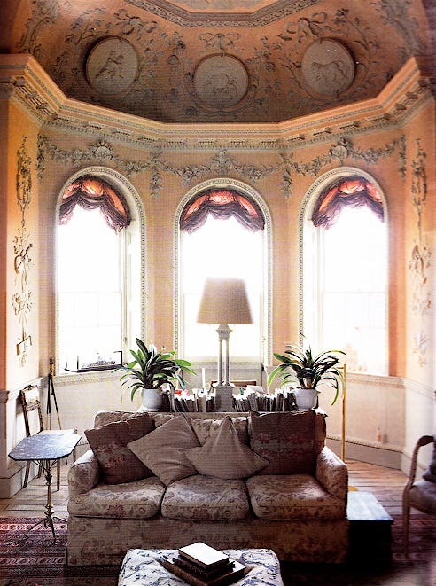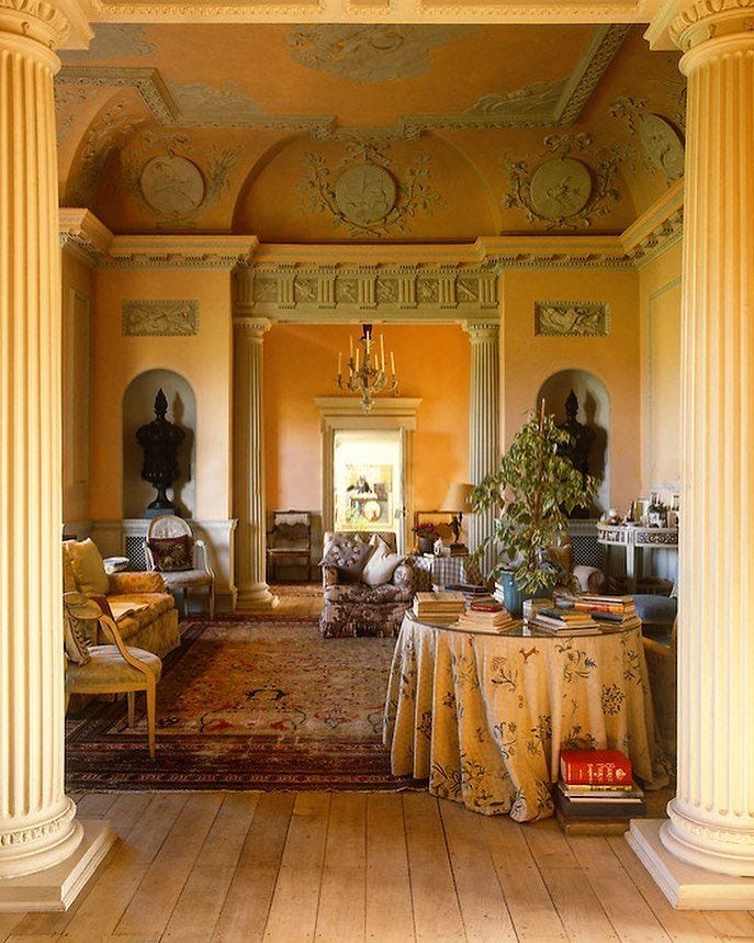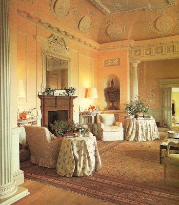 While the story of a triumphant restoration is enough to get me going, I can’t help but be inspired by the image of Gervase and Kirby living their day-to-day life in this magical world. The furnishings are unpretentious, with loose-covered armchairs and skirted-tables. Gervase’s study nook, in the corner of the great room, is the perfect temple to classicism. The rug is a masterpiece, and the scheme of pale pink and grey feels timeless (however overdone and butchered it has been today). It looks like somewhere you could live fully, abundantly, generously. The perfect backdrop to spend winter weekends in front of the fire, or long summer evenings overlooking the parkland.